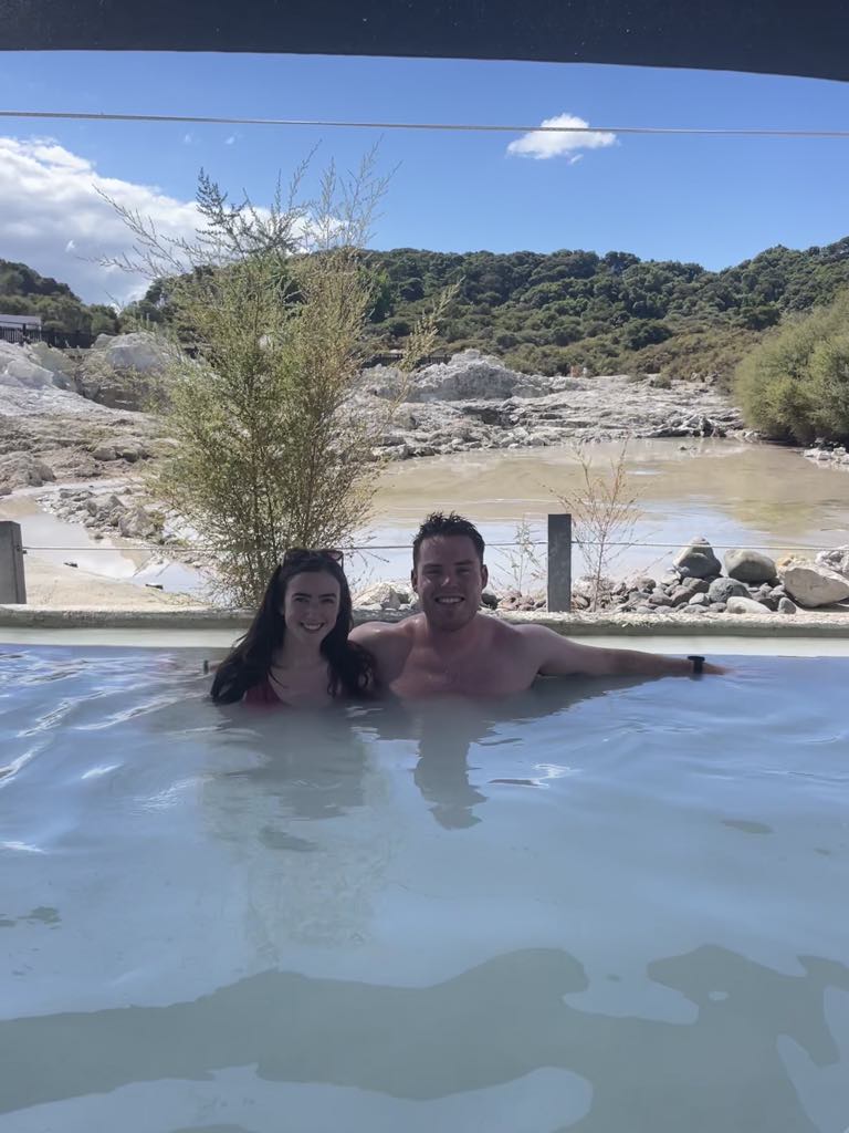 Rotorua truly earns its nicknames ‘rotten-rua’ and ‘sulphur city’. The smell of rotten eggs hangs in the air and is caused by the geothermal activity (hydrogen sulphide) across the region. Noses sufficiently bunged, we went to Hells Gate to bathe in the sulphur pools and mud spa. They told us to wear throw-aways into the spa and remove all jewellery for 3 days afterwards.