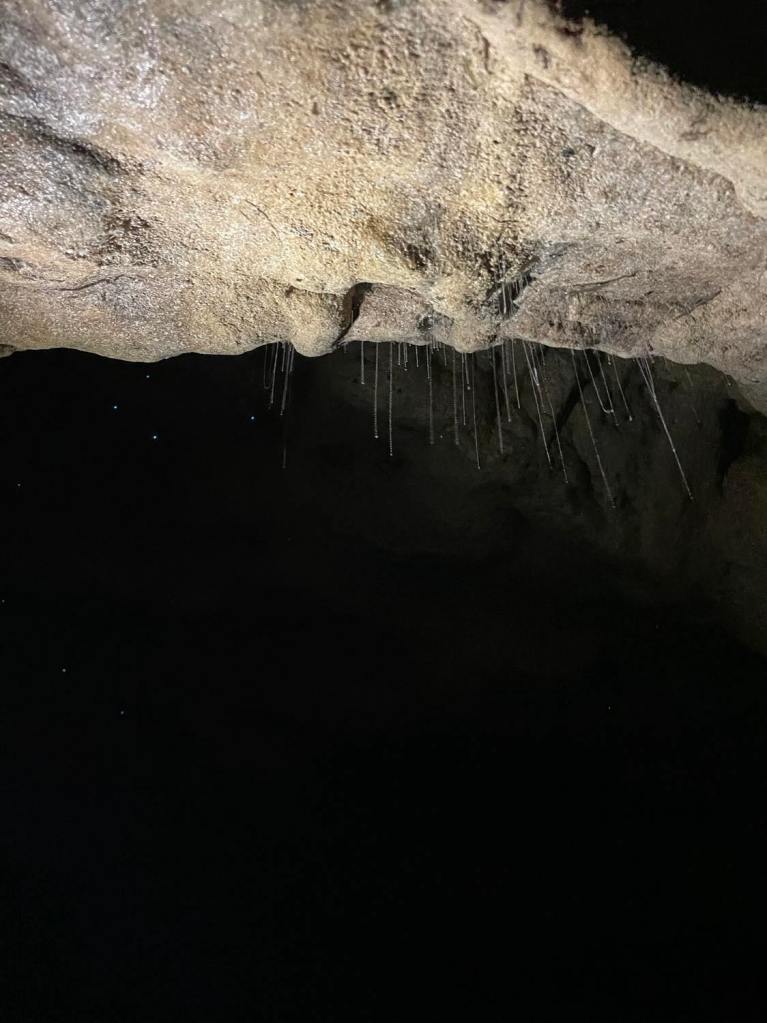 The glow worms are the larvae of fungus gnats. The gnats lay the eggs in isolated groups to make sure that the first born glow worm doesn’t eat all the other eggs! The glow worms live in little hammocks they’ve made, just off the face of the rock. They set threads (traps) up to 7 inches to catch their prey (mayflies). The surrounding area of the cave mouths are protected and nurtured by the locals. This includes planting specific tree species to attract mayflies. This in turn ensures the glow worm populations continue to thrive.
