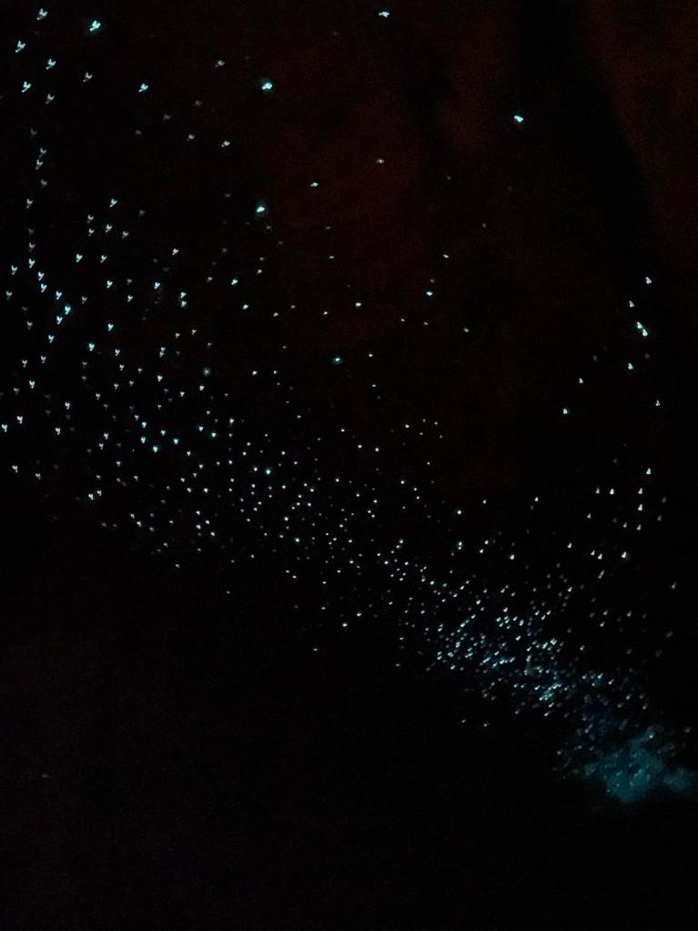 The glow worms covered the cave ceilings like a blanket of neon blue lights and as time went on and our eyes adjusted, the lights intensified and they seemed to multiply.